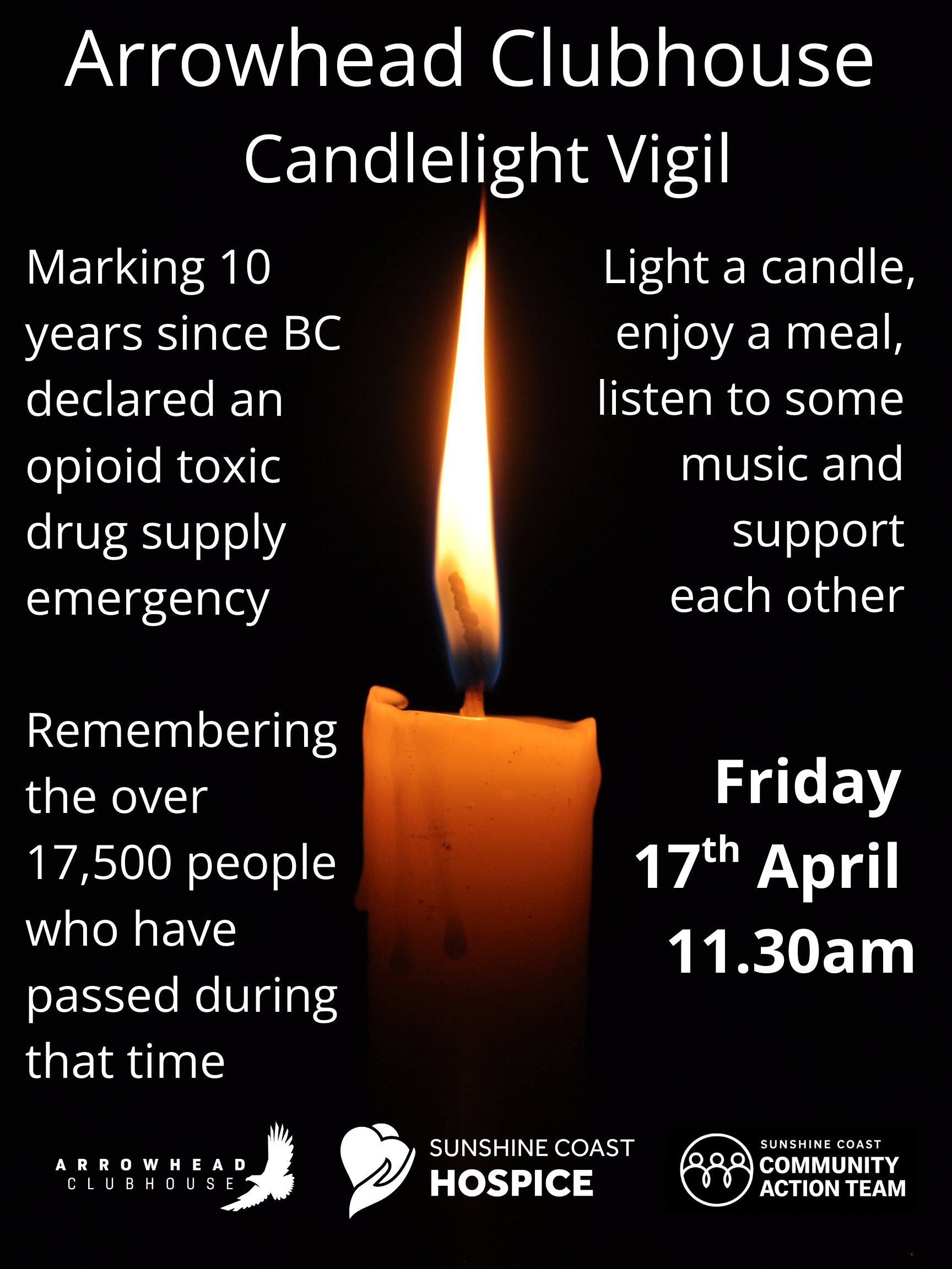To mark the anniversary, Arrowhead Clubhouse, working alongside the Sunshine Coast Community Action Team (CAT) and the amazing people at Sunshine Coast Hospice, will be holding a vigil and celebration of love and life for all those who have been taken too soon. We will be lighting 80 candles through out the Clubhouse to remember those we have loved and lost.